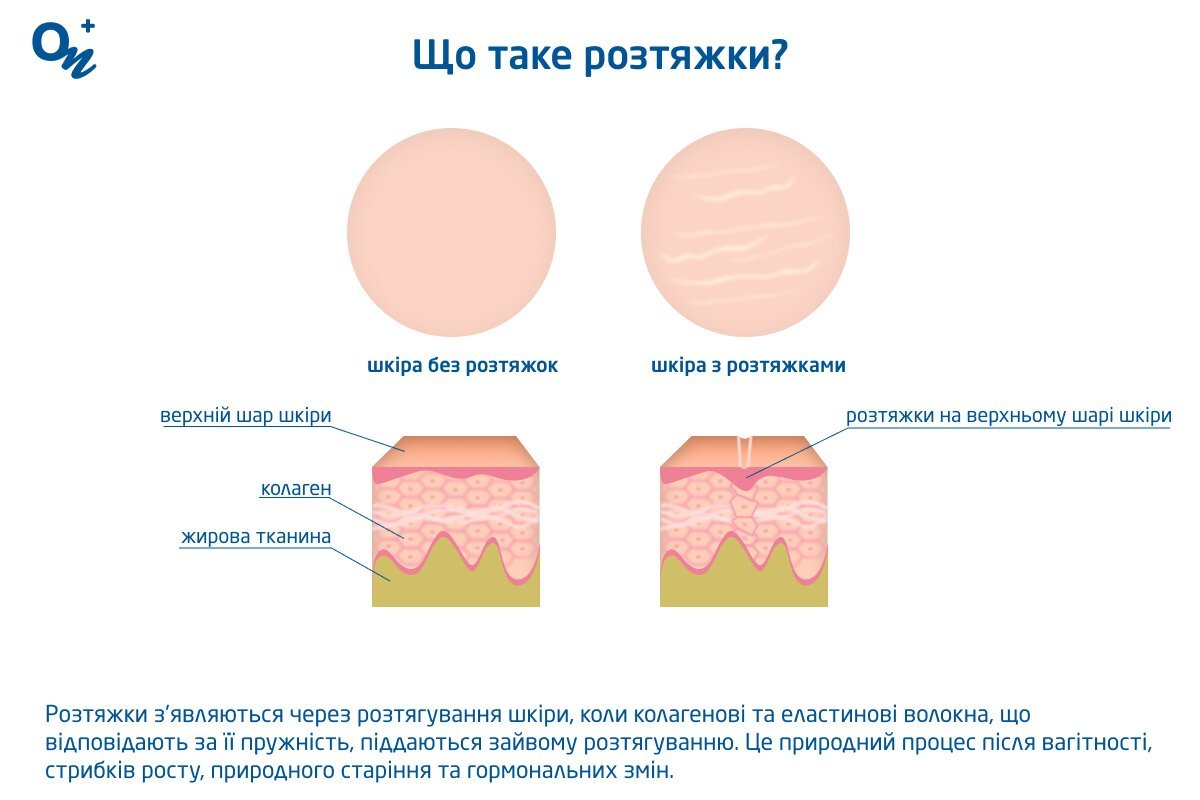 Розтяжки виникають на рівні дерми, де волокна колагену та еластину розриваються через надмірне натягнення шкіри.