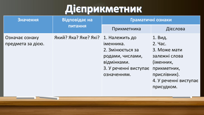 • «Який?» (на питання відповідає дієприкметник у ролі прикметника, як з’ясовується із презентації на платформі «На Урок»). Наприклад, блискучий камінь чи писаний лист.
