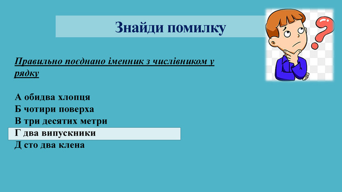 - Перевірте рід та число іменника, з яким поєднується числівник.