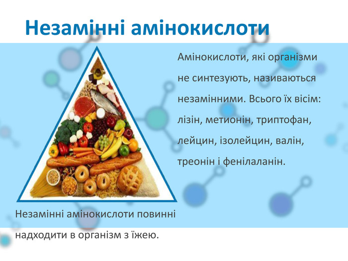 Незамінні амінокислоти – це ті, які не можуть бути синтезовані нашим організмом і тому повинні постійно надходити з продуктами харчування. До них належать: