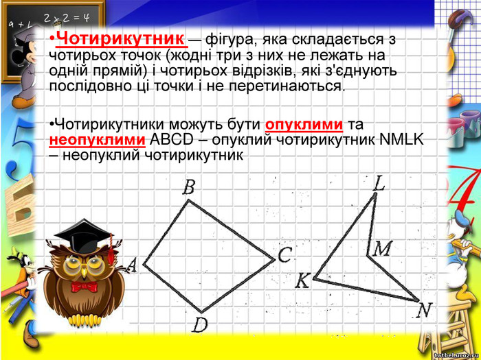 - Паралелограм – чотирикутник, де протилежні сторони попарно паралельні та рівні.