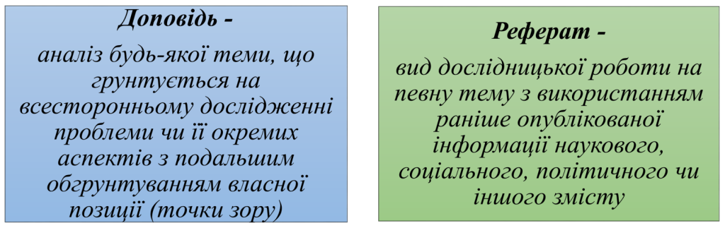 Доповідь – це усне або письмове повідомлення, яке готується з метою донесення конкретної інформації чи аналізу з певної теми до аудиторії. Вона може бути складена на основі досліджень, експериментів або літературних джерел і наділена структурою, яка сприяє зрозумілості та чіткості викладення думок.