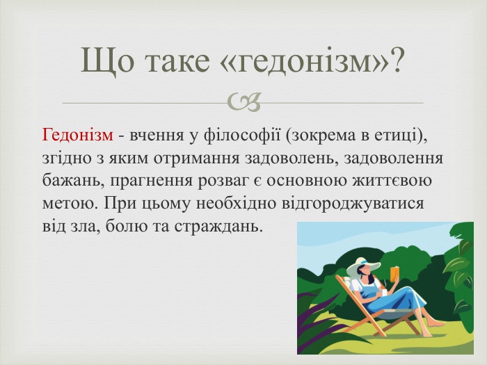 - Задоволення як мета життя. Гедонізм стверджує, що кінцевою метою людського існування є досягнення максимального задоволення і скорочення страждань.