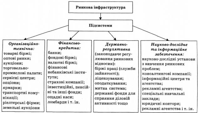 Згідно з підручниками економіки, інфраструктура ринку є частиною загальної інфраструктури і включає в себе засоби, що забезпечують торгівлю і конкурентне середовище. Її елементи включають фінансові інститути, системи оподаткування, ринок праці, системи статистичного обліку і регулятори. Умови і якість інфраструктури ринку можуть значно впливати на економічний стан держави, взаємодію між різними ринковими учасниками і загальну продуктивність економіки.
