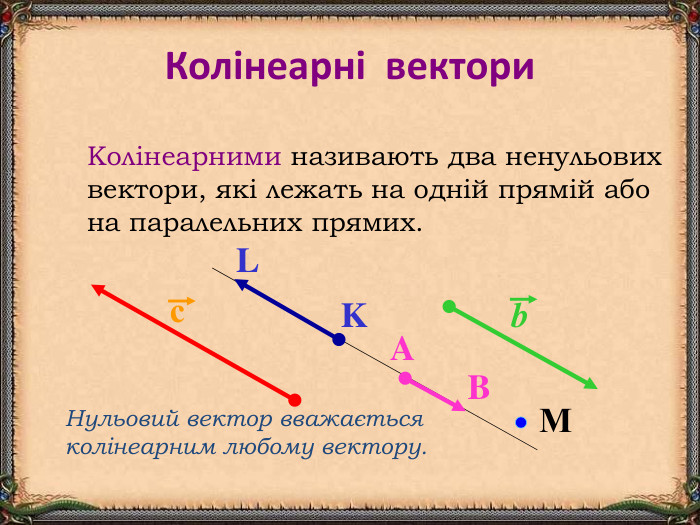 Розглянемо детальніше, що саме вектори називають колінеарними. Формально, два вектори a і b будуть колінеарними, якщо існує таке число k, яке відповідає наступному рівнянню: