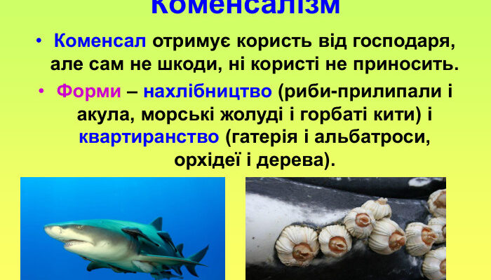 - Еволюційний тиск: Коменсалізм може стимулювати розвиток адаптацій, що дозволяють організмам краще пристосовуватися до умов існування.