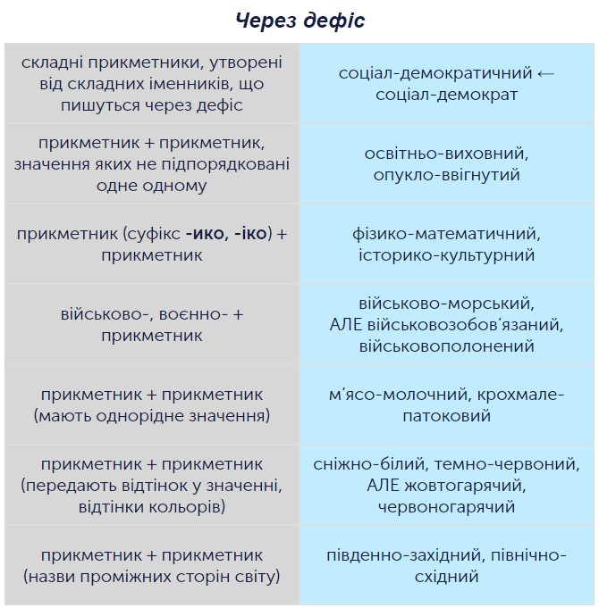 - Винятки в написанні: деякі складні прикметники утворюються із вживанням дефісу. Це стосується паритетних компонентів, як-от “молочно-кислий”;