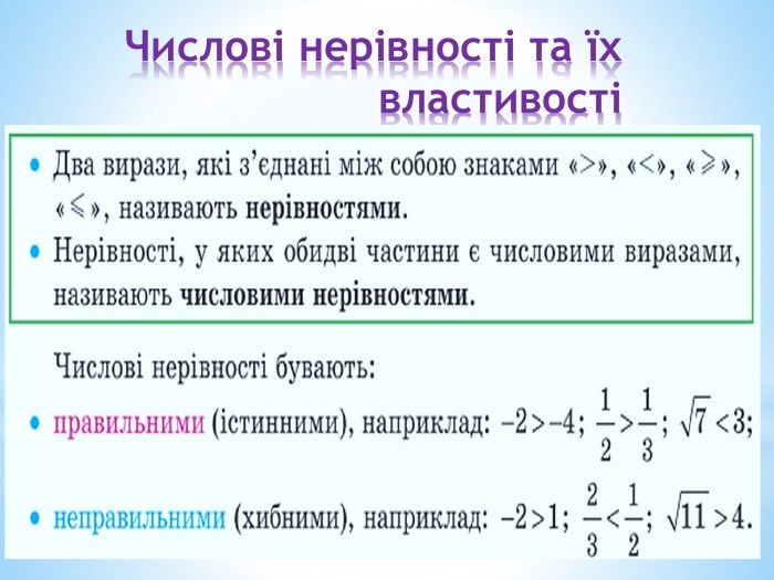 Для роботи з нерівностями використовуються певні основні властивості, які дозволяють маніпулювати та спрощувати їх. У таблиці нижче наведено основні властивості нерівностей: