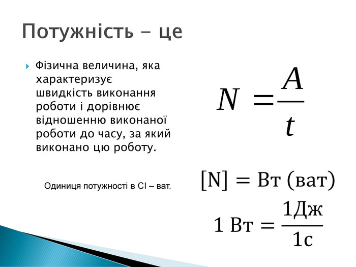 Основною одиницею вимірювання потужності в Міжнародній системі одиниць (СІ) є ват (Вт). Один ват відповідає швидкості виконання роботи в один джоуль за одну секунду (1 Вт = 1 Дж/с).