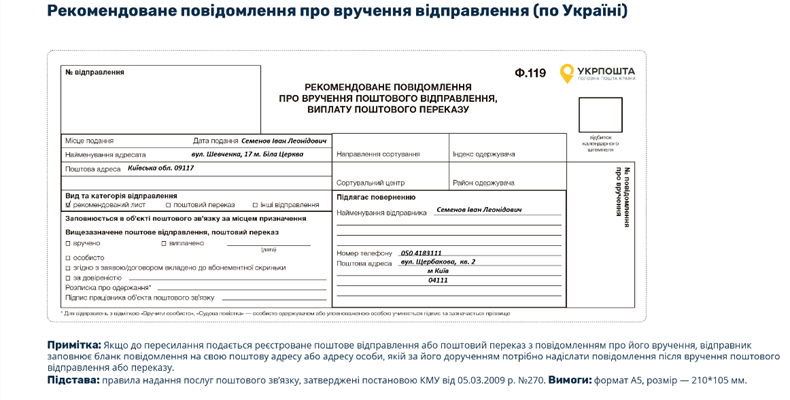 - Заповнити форму на пошті з вказанням даних відправника та отримувача.