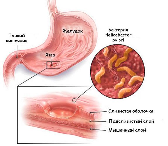 - Бактерія Helicobacter pylori. Це одна з найпоширеніших причин язви. Бактерія колонізує слизову оболонку шлунка і викликає її запалення.