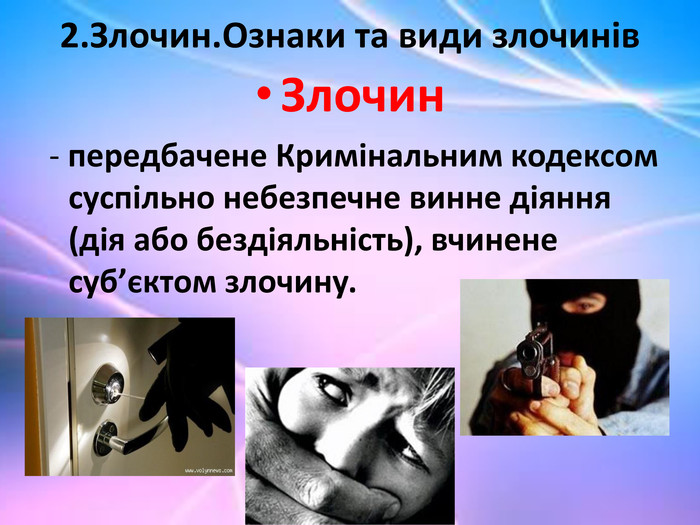 2. Злочини проти власності, такі як крадіжка, шахрайство, розбій.
