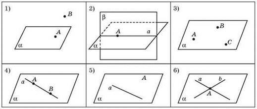- Використовуючи аксіоми стереометрії, через точку A можна провести нескінченну множину прямих, але тільки одну площину, яка охоплює ці прямі.