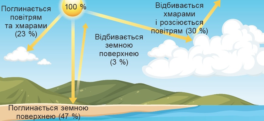 - Відбивання: Частина випромінювання відбивається назад у космос безпосередньо від хмар, атмосферних частинок та самої земної поверхні.