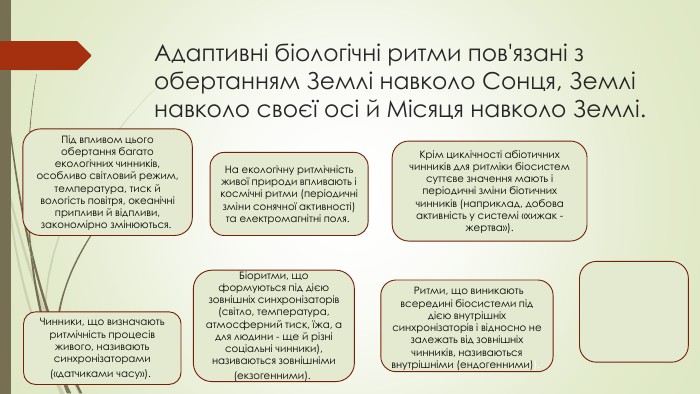 Обертання Землі навколо Сонця впливає на біологічні ритми через зміни у тривалості днів й ночей, інтенсивності освітлення та температури. Це, у свою чергу, забезпечує гармонію між внутрішніми процесами організмів і зовнішнім середовищем.