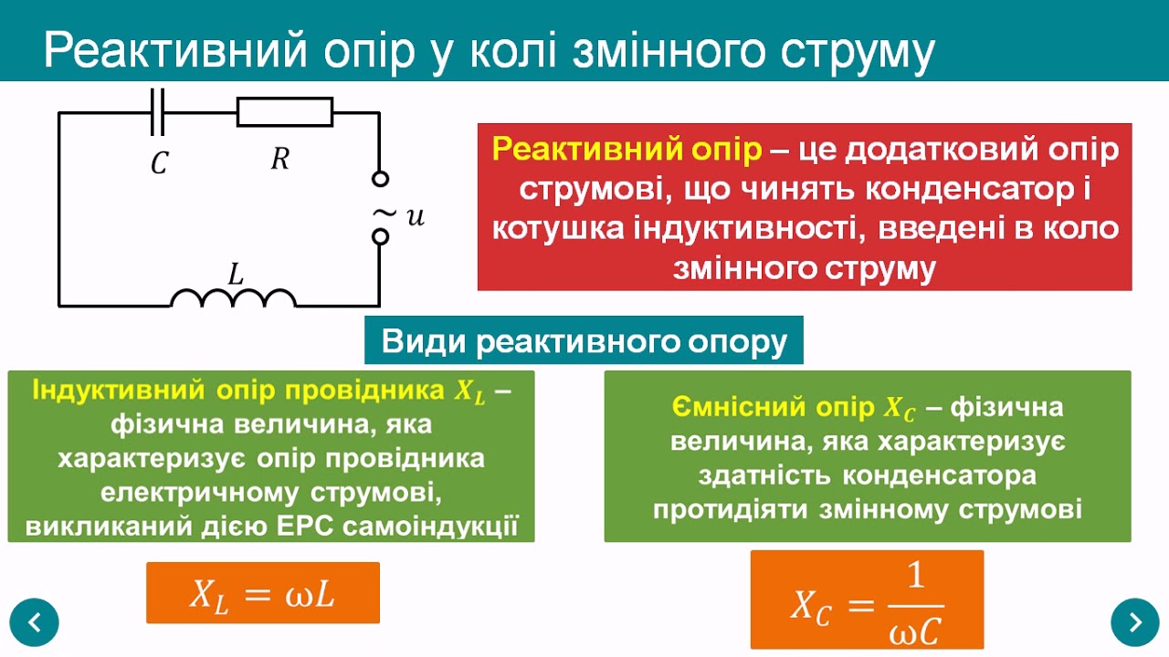 1. XC = 1 / (2πfC) де f – частота змінного струму, C – ємність у фарадах.
