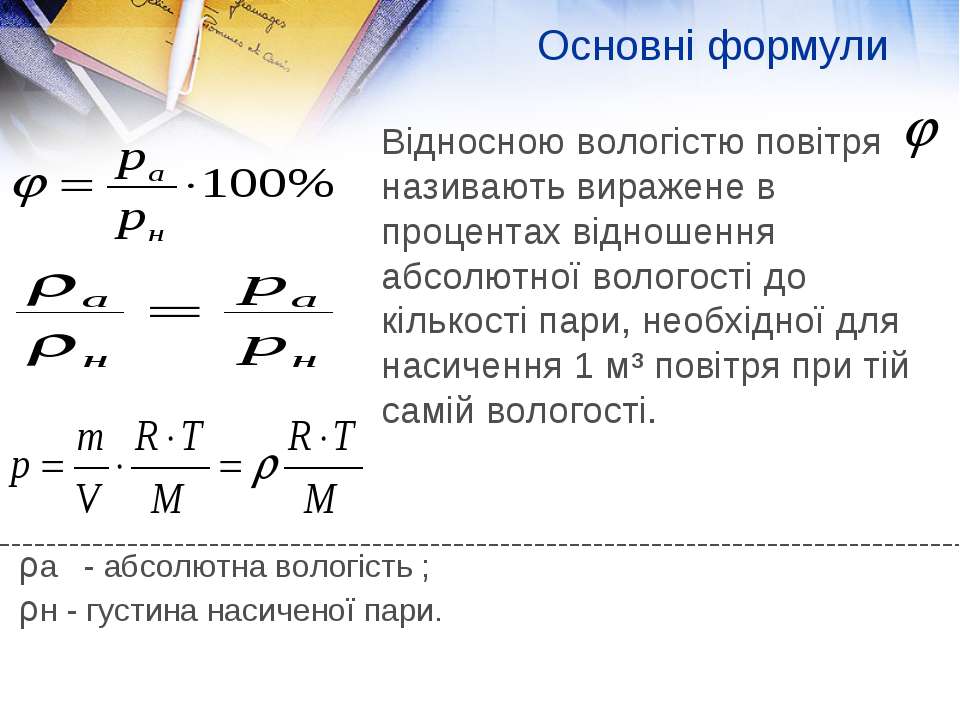 Обчислення абсолютної вологості базується на основних принципах фізики та завжди залежать від температури і тиску повітря. Основна формула виглядає наступним чином: