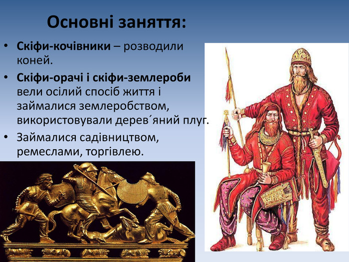 | Кочове скотарство | Скіфи славилися своєю майстерністю у розведенні табунів коней, які служили не лише як засіб пересування, але й як важливий атрибут скіфської військової сили. |