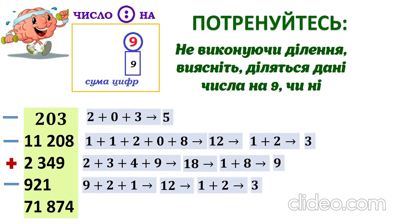 - Щоб дізнатися, чи ділиться число на 9, потрібно скласти всі його цифри.