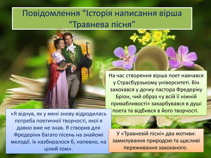 | Кохання і щастя | Емоційність, натхнення, гармонія | Образи природи, весни, почуттів |