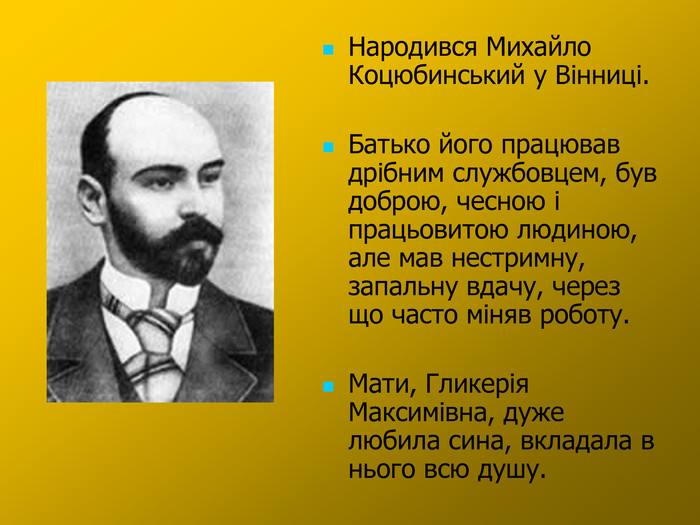 • Народження та дитинство: Михайло Михайлович Коцюбинський народився 17 вересня 1864 року у Вінниці. Його родина мала польське коріння, але зберігала українську національну ідентичність.