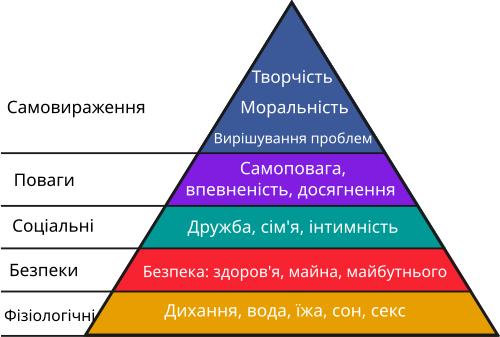 Маслоу стверджував, що людські потреби організовані у формі ієрархії. Він вважав, що поки нижчі потреби не задоволені, вищі потреби не можуть впливати на поведінку людини.