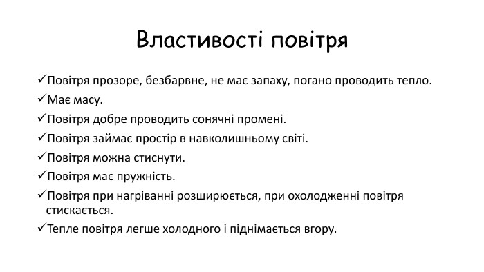 Давайте розглянемо табличну форму деяких з чітких властивостей повітря: