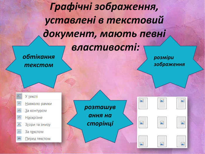 | Розміщення | Позиціювання відносно тексту, обтікання зображення, інші параметри розташування. |
