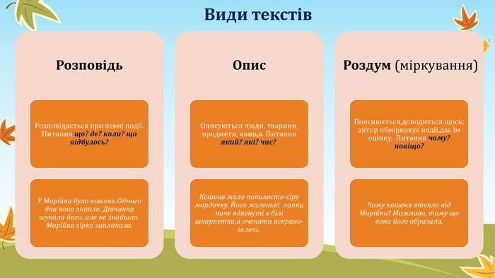 1. Академічна сфера: Методологія викладання орієнтована на поєднання описового, розповідного та міркувального мовлення для підвищення ефективності навчання.
