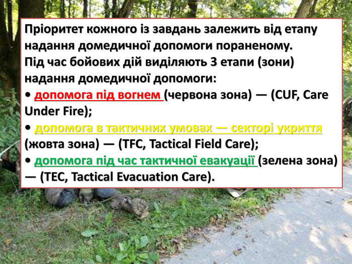 Під час бойових дій виділяють зони надання домедичної допомоги, які розподіляються на основі наближеності до лінії вогню та ризику для тих, хто надає допомогу: